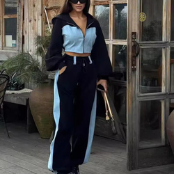 Conjunto de Camisa com Capuz e Zíper no Umbigo e Calças Flare de Cintura Alta BR6065 Outono Inverno Sexy Spice Girls