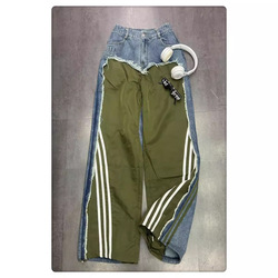 BH1314 kadın baharatlı yeni moda çizgili şık Denim Patchwork gevşek düz bacak pantolon