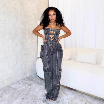 Br5505 Của Phụ Nữ Cao Denim Jumpsuit Strapless Đa-Túi Quần Vận Chuyển Hàng Hóa Mô Hình