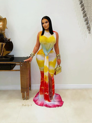 Br6018 Thời Trang Mỏng Sexy Không Tay Thanh Lịch Gradient Tie Thiết Kế Bodycon Cao Eo Voan Dài